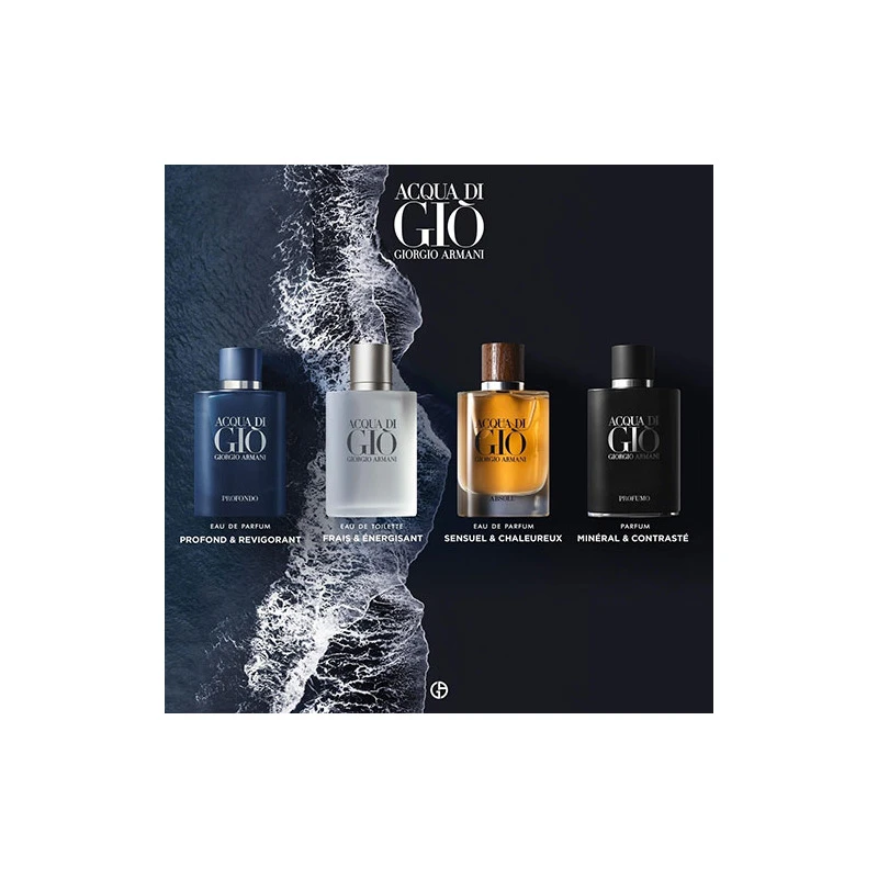Acqua Di Gio est un parfum mythique qui marie le sucrĂ© et le salĂ© dans un effet doux amer qui Ă©voque la peau gorgĂ©e d’eau et de soleil. Une fĂŞte de notes marines, florales comme le jasmin, mordantes comme le ciste et le romarin, fruitĂ©es comme le kaki.